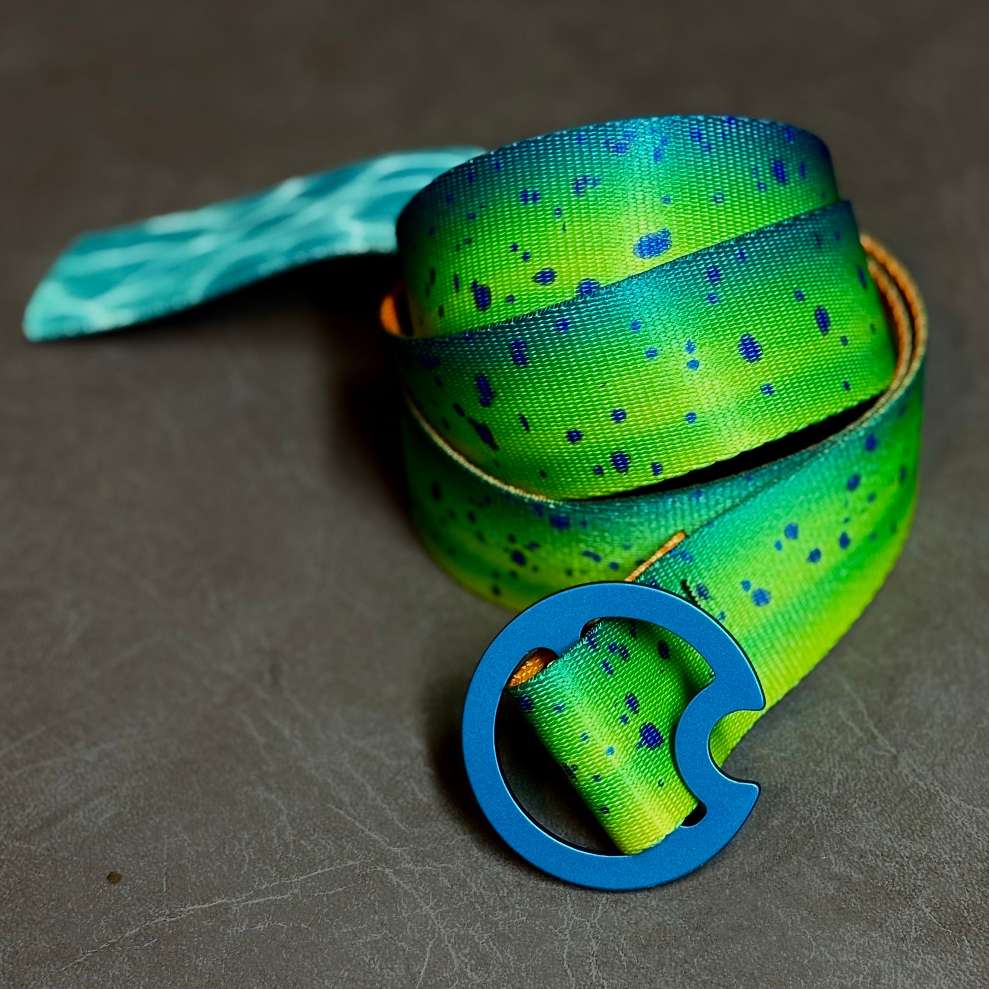 Reel in your excitement for a salty fin-tastic catch with the bright MAHI MAHI/DORADO BELT. Reversible to bluewater light refraction.