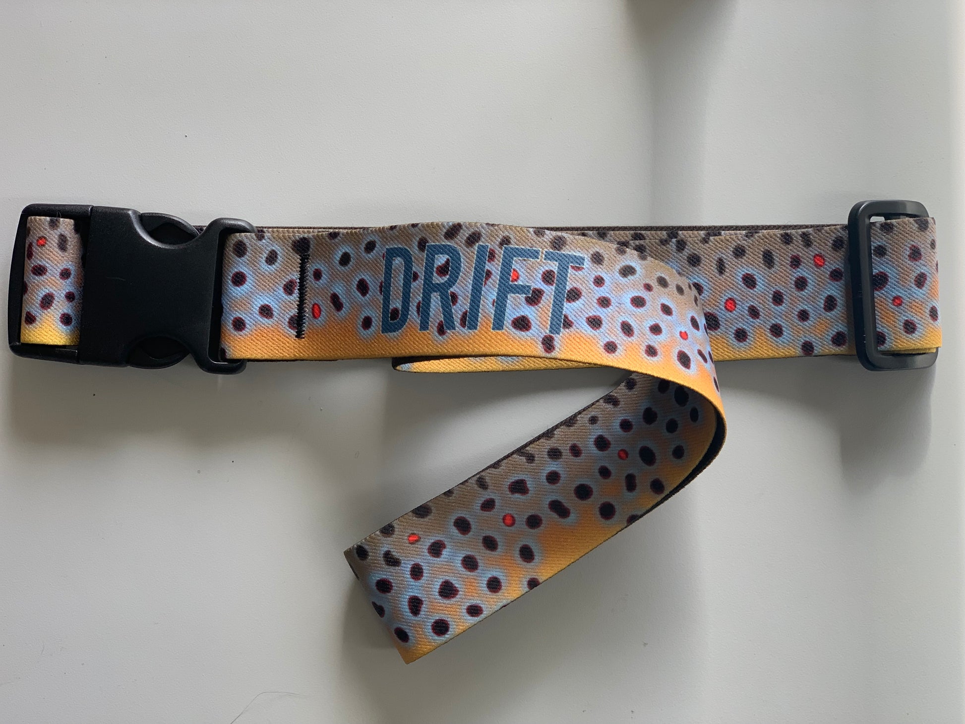 This 1.5" wide x 52" long elastic wading belt with heavy duty plastic side release buckles features the lifelike spotting and color of the Brown Trout. It is fully adjustable to most waist sizes with the ability to adjust to desired tightness. The vivid colors are fade and bleed resistant, ensuring long-lasting wear. The design perfectly complements standard Simms and Patagonia wader colors.