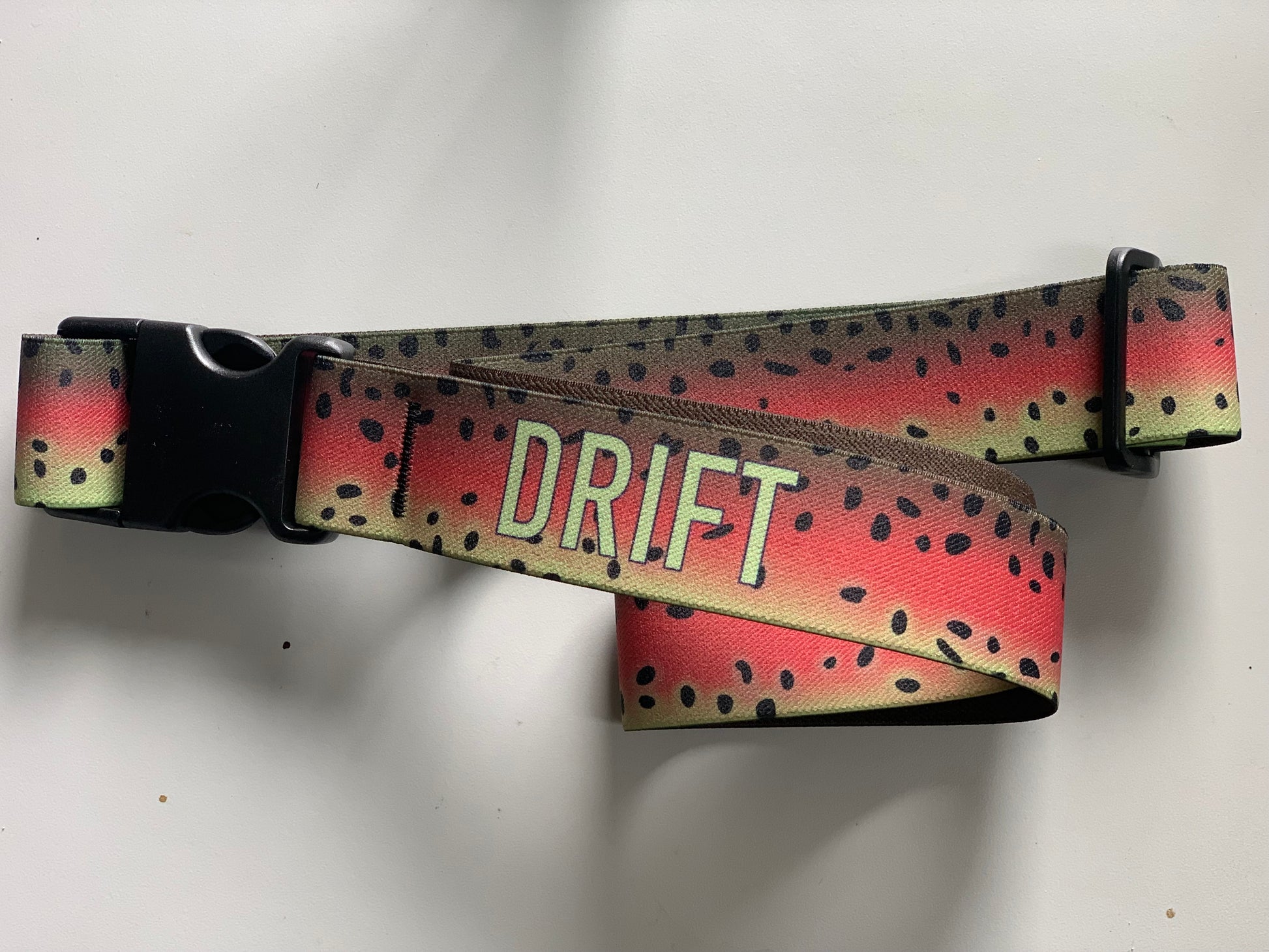 This 1.5" wide x 52" long elastic wading belt with heavy duty plastic side release buckles features the color and spotting of a native Rocky Mountain rainbow trout. It is fully adjustable to most waist sizes with the ability to adjust to desired tightness. The vivid colors are fade and bleed resistant, ensuring long-lasting wear. The design perfectly complements standard Simms and Patagonia wader colors.