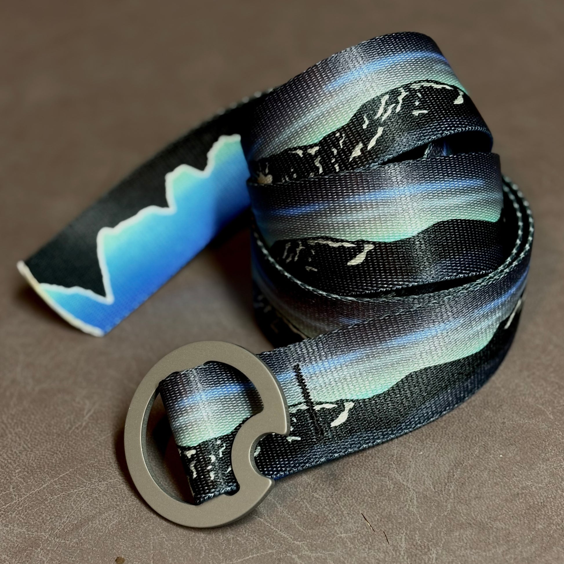 Wear your love of the mountains with this 1.5" wide x 52" long belt featuring a micro-adjustable, non-slip buckle. The vivid colors are fade and bleed resistant, ensuring long-lasting wear. Suitable for all sizes up to a 45" waist, simply trim to your desired length. The bold and adventurous design comes with a standard, matte gray buckle.