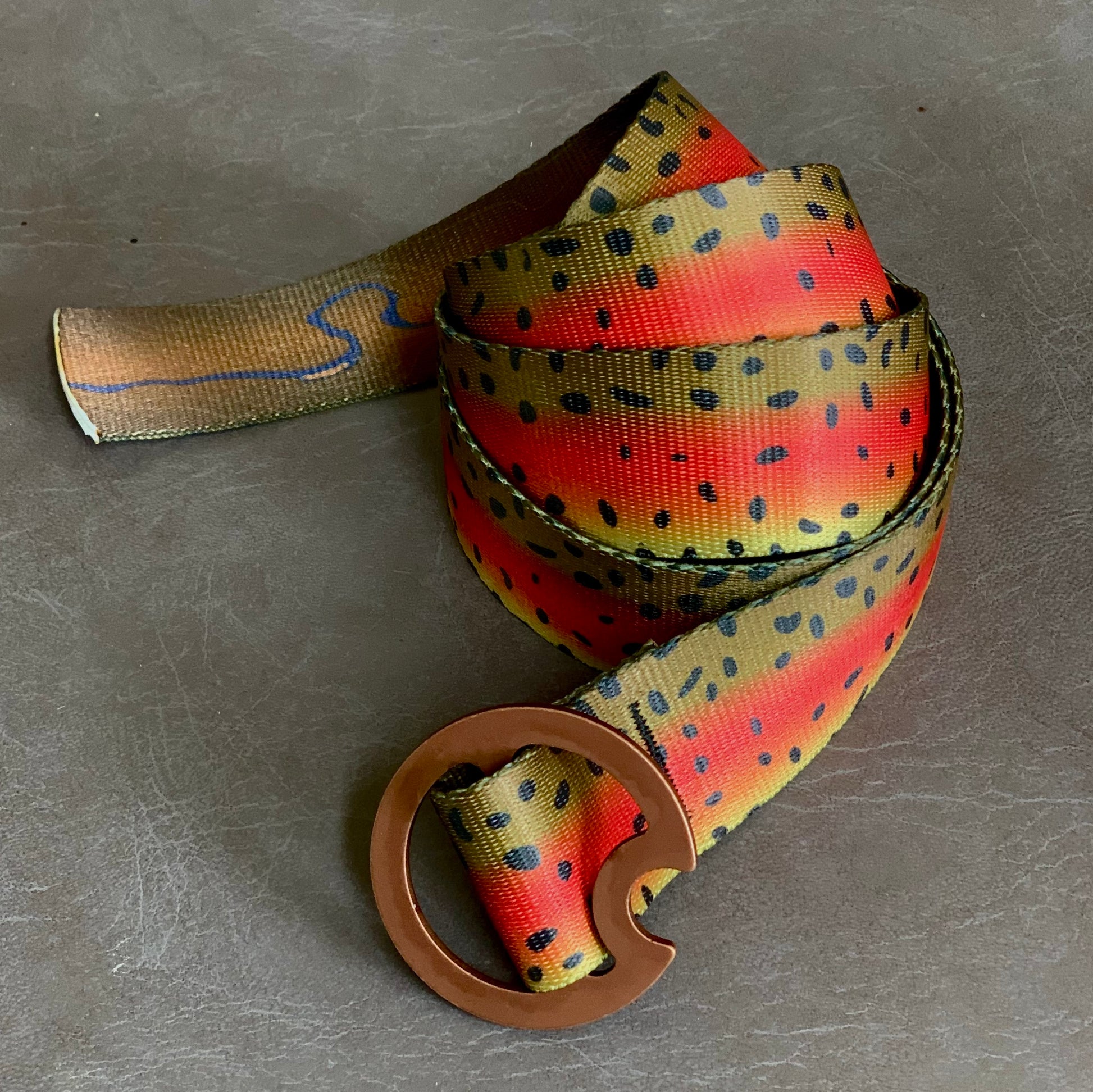 The NATIVE REDSIDE TROUT BELT, with authentic coloring and spotting of the Deschutes or McKenzie River legend. Reversible to brown tone river topo.